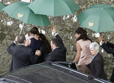 One of the celebrity guests was 7-month-old Suri, the couple's daughter, who, dressed in white, arrived in her arms of her mother. Holmes wore a black dress and boots before she changed into a Giorgio Armani gown for the wedding. Cruise came from Rome, where the family had been staying in a luxury hotel near the Spanish steps, in a van and, sporting dark shades, waved to fans.